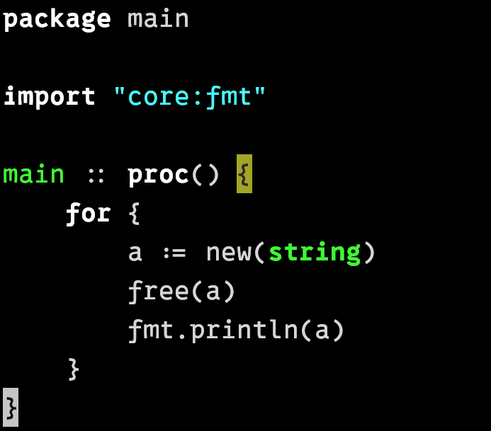 Based on my assumptions, only the last line of this should be able to cause a runtime error. In my quick test on a Windows machine, it doesn’t. It just prints “hello” which is expected because the memory hasn’t been overridden with anything else. When I use odin run . -sanitize:address, that last print still doesn’t crash, but at least just prints random bytes. I don’t know if odin has some debug allocator or build mode that could be used to make this mistake more obvious.